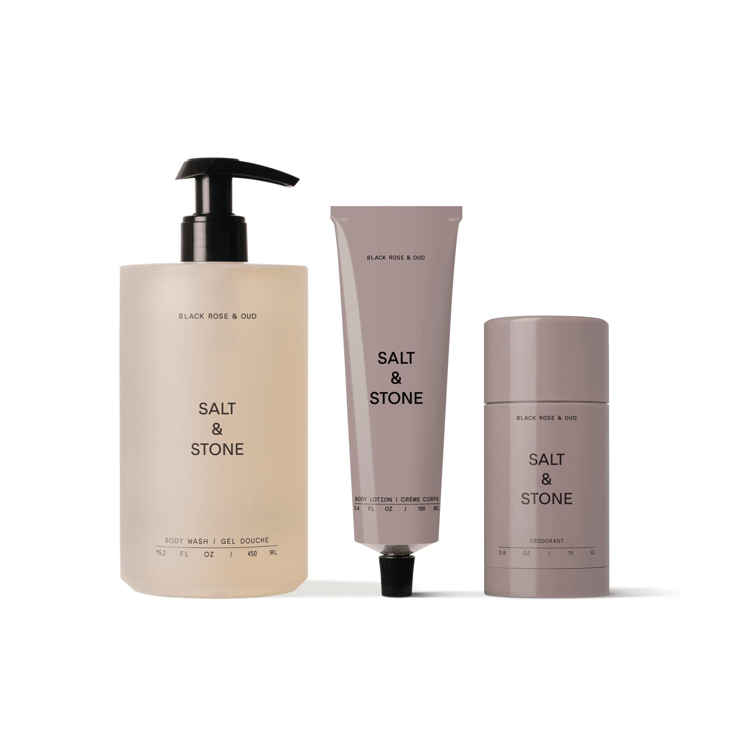 A trio of dark. floral Black Rose essentials. Cleanse with body wash. protect with deodorant. and hydrate with body lotion.